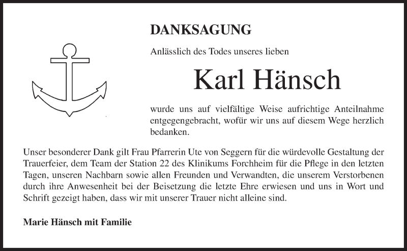 Hier finden Sie alle Traueranzeigen aus der Zeitung, die bisher für Karl Hänsch erschienen sind. Weitere Traueranzeigen, die in der Zeitung erscheinen, werden hier ebenfalls aufgelistet