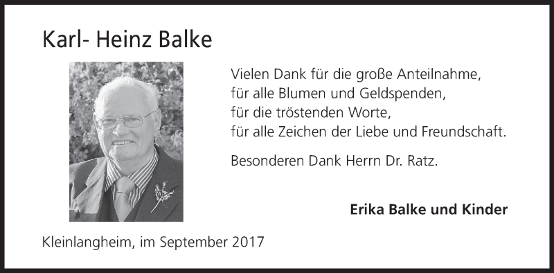 Hier finden Sie alle Traueranzeigen aus der Zeitung, die bisher für Karl- Heinz Balke erschienen sind. Weitere Traueranzeigen, die in der Zeitung erscheinen, werden hier ebenfalls aufgelistet