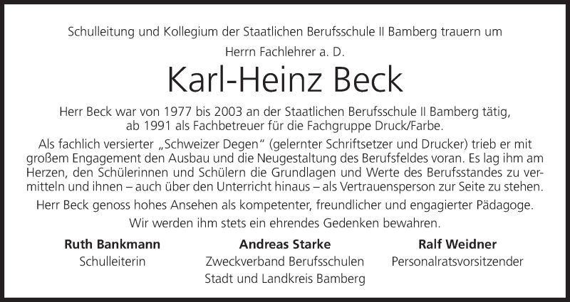 Hier finden Sie alle Traueranzeigen aus der Zeitung, die bisher für Karl-Heinz Beck erschienen sind. Weitere Traueranzeigen, die in der Zeitung erscheinen, werden hier ebenfalls aufgelistet