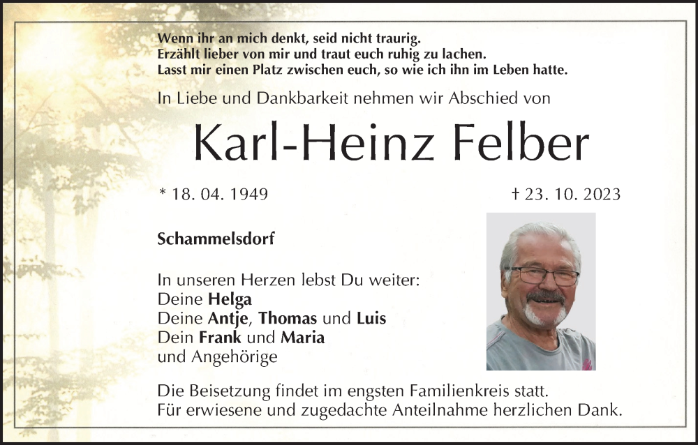 Hier finden Sie alle Traueranzeigen aus der Zeitung, die bisher für Karl-Heinz Felber erschienen sind. Weitere Traueranzeigen, die in der Zeitung erscheinen, werden hier ebenfalls aufgelistet
