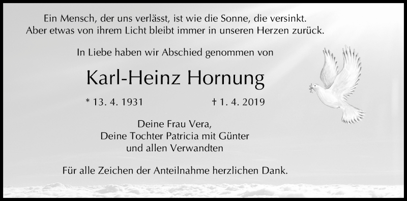 Hier finden Sie alle Traueranzeigen aus der Zeitung, die bisher für Karl-Heinz Hornung erschienen sind. Weitere Traueranzeigen, die in der Zeitung erscheinen, werden hier ebenfalls aufgelistet