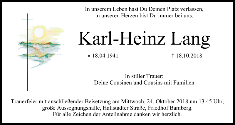 Hier finden Sie alle Traueranzeigen aus der Zeitung, die bisher für Karl-Heinz Lang erschienen sind. Weitere Traueranzeigen, die in der Zeitung erscheinen, werden hier ebenfalls aufgelistet