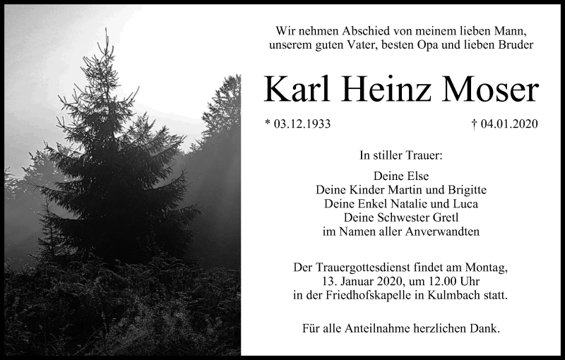 Hier finden Sie alle Traueranzeigen aus der Zeitung, die bisher für Karl Heinz Moser erschienen sind. Weitere Traueranzeigen, die in der Zeitung erscheinen, werden hier ebenfalls aufgelistet