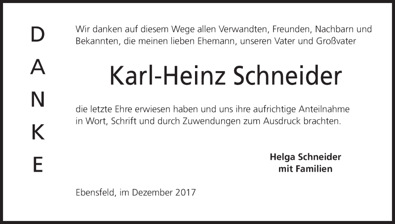 Hier finden Sie alle Traueranzeigen aus der Zeitung, die bisher für Karl-Heinz Schneider erschienen sind. Weitere Traueranzeigen, die in der Zeitung erscheinen, werden hier ebenfalls aufgelistet