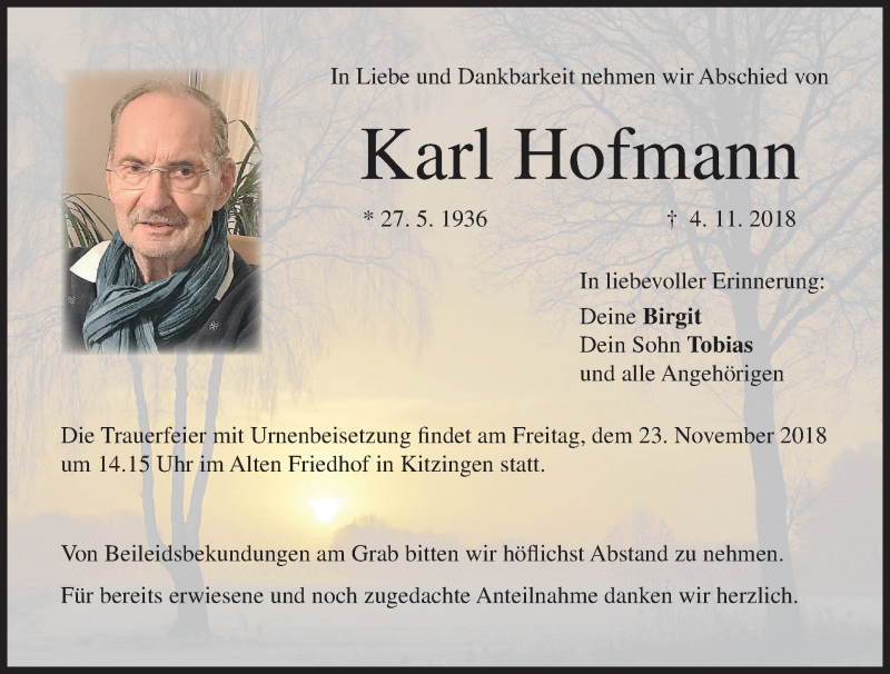 Hier finden Sie alle Traueranzeigen aus der Zeitung, die bisher für Karl Hofmann erschienen sind. Weitere Traueranzeigen, die in der Zeitung erscheinen, werden hier ebenfalls aufgelistet