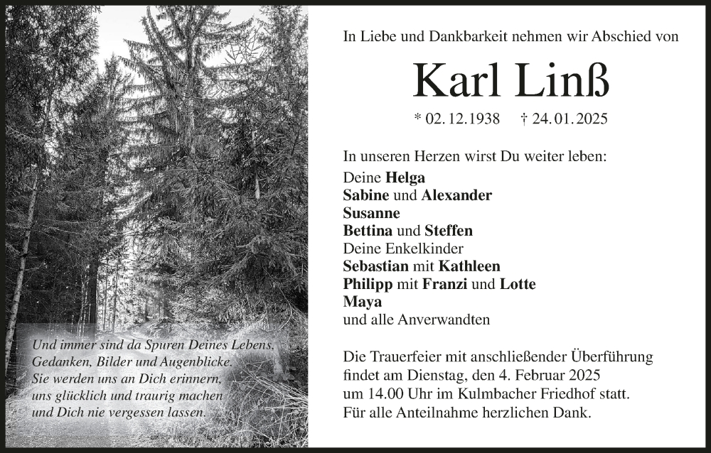 Hier finden Sie alle Traueranzeigen aus der Zeitung, die bisher für Karl Linß erschienen sind. Weitere Traueranzeigen, die in der Zeitung erscheinen, werden hier ebenfalls aufgelistet