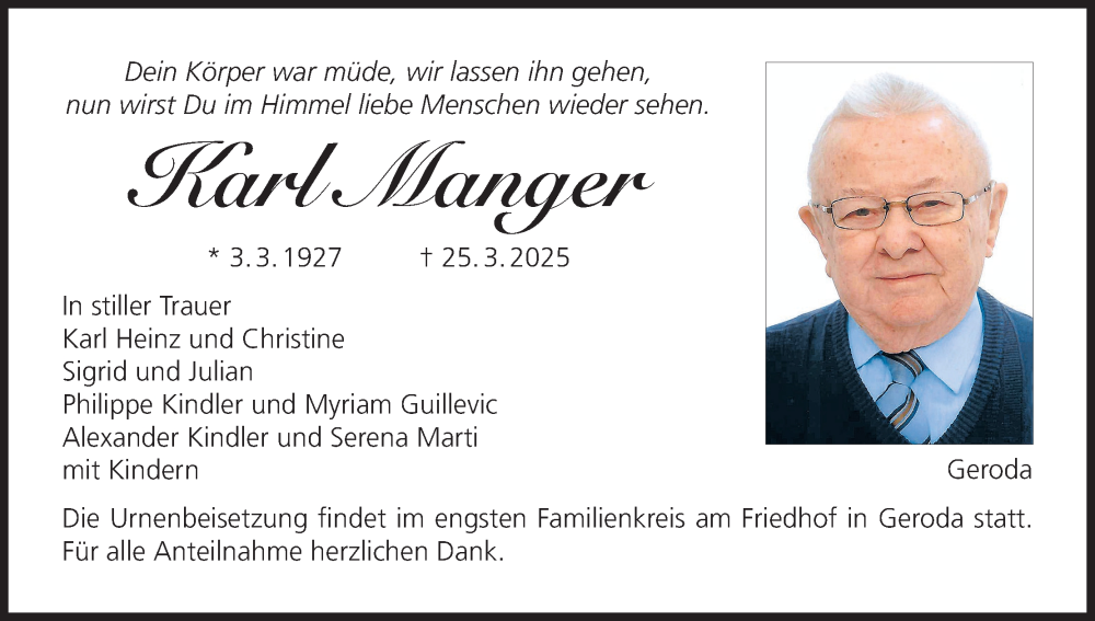 Hier finden Sie alle Traueranzeigen aus der Zeitung, die bisher für Karl Manger erschienen sind. Weitere Traueranzeigen, die in der Zeitung erscheinen, werden hier ebenfalls aufgelistet