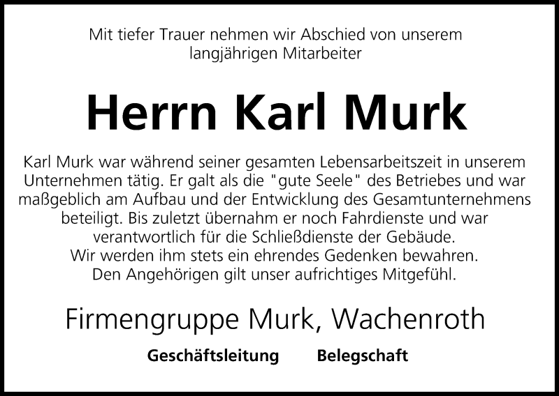 Hier finden Sie alle Traueranzeigen aus der Zeitung, die bisher für Karl Murk erschienen sind. Weitere Traueranzeigen, die in der Zeitung erscheinen, werden hier ebenfalls aufgelistet
