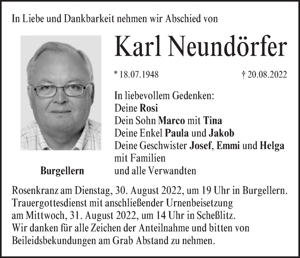 Hier finden Sie alle Traueranzeigen aus der Zeitung, die bisher für Karl Neundörfer erschienen sind. Weitere Traueranzeigen, die in der Zeitung erscheinen, werden hier ebenfalls aufgelistet
