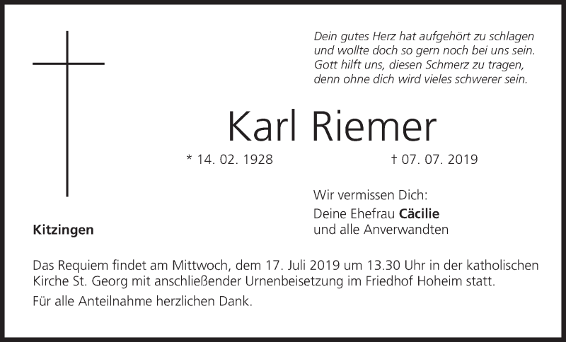 Hier finden Sie alle Traueranzeigen aus der Zeitung, die bisher für Karl Riemer erschienen sind. Weitere Traueranzeigen, die in der Zeitung erscheinen, werden hier ebenfalls aufgelistet