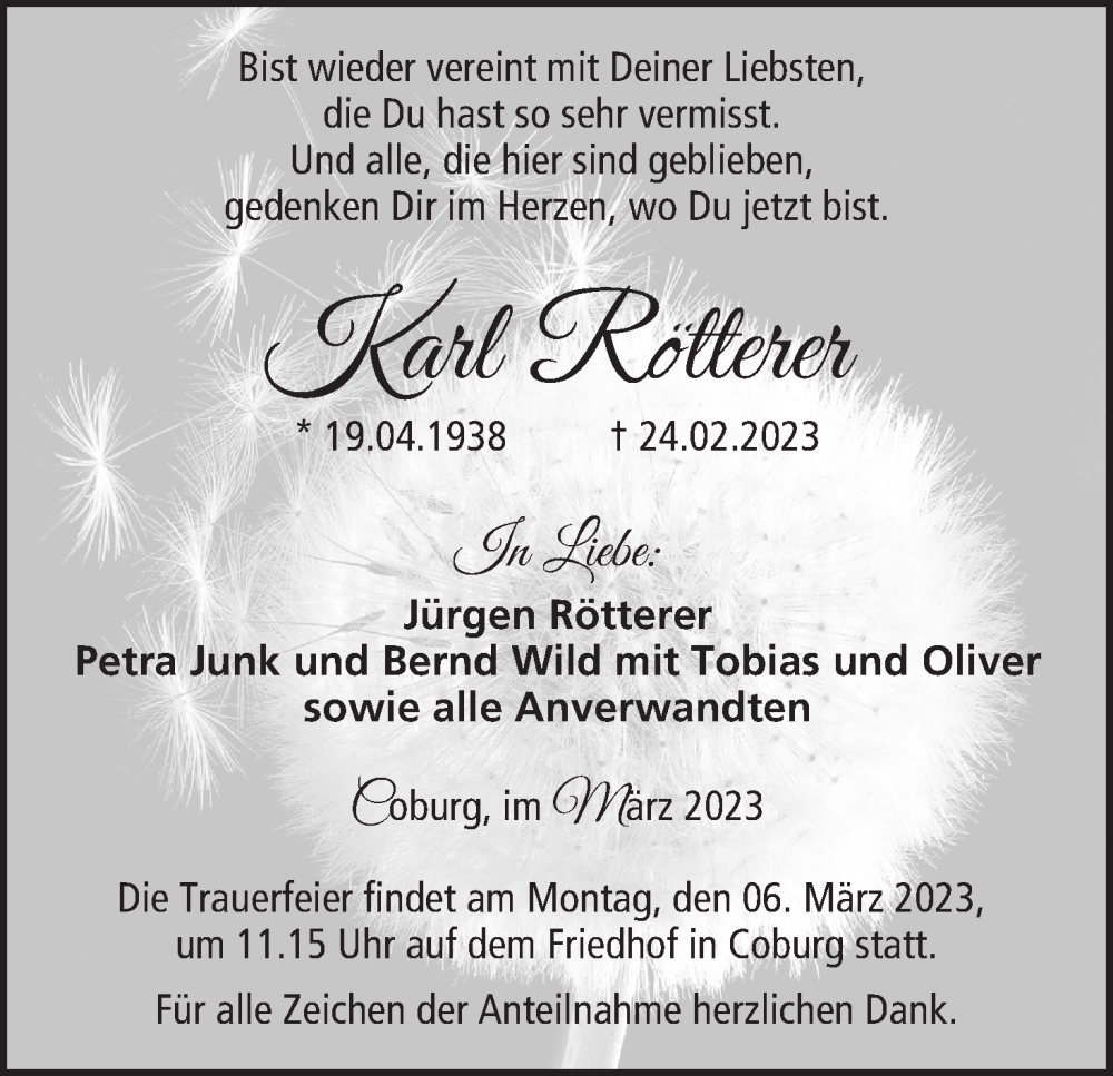 Hier finden Sie alle Traueranzeigen aus der Zeitung, die bisher für Karl Rötterer erschienen sind. Weitere Traueranzeigen, die in der Zeitung erscheinen, werden hier ebenfalls aufgelistet