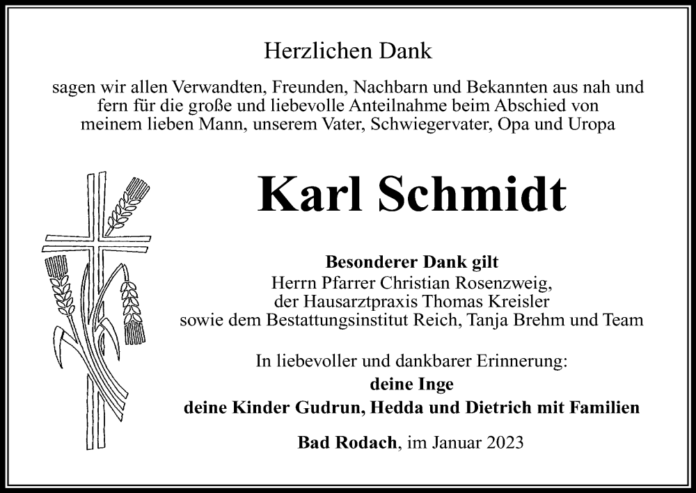 Hier finden Sie alle Traueranzeigen aus der Zeitung, die bisher für Karl Schmidt erschienen sind. Weitere Traueranzeigen, die in der Zeitung erscheinen, werden hier ebenfalls aufgelistet
