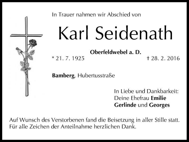 Hier finden Sie alle Traueranzeigen aus der Zeitung, die bisher für Karl Seidenath erschienen sind. Weitere Traueranzeigen, die in der Zeitung erscheinen, werden hier ebenfalls aufgelistet