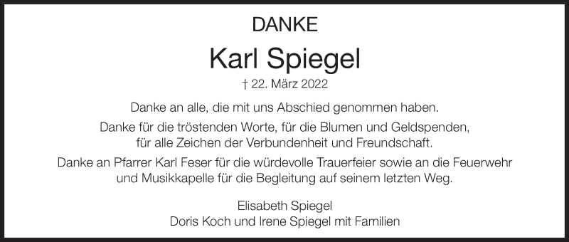 Hier finden Sie alle Traueranzeigen aus der Zeitung, die bisher für Karl Spiegel erschienen sind. Weitere Traueranzeigen, die in der Zeitung erscheinen, werden hier ebenfalls aufgelistet