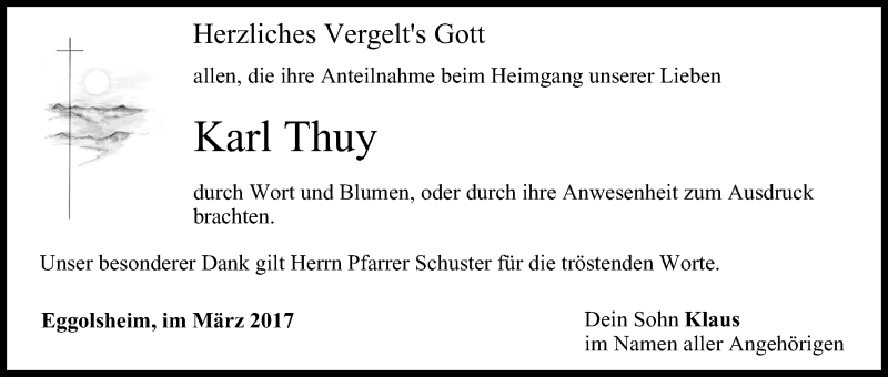 Hier finden Sie alle Traueranzeigen aus der Zeitung, die bisher für Karl Thuy erschienen sind. Weitere Traueranzeigen, die in der Zeitung erscheinen, werden hier ebenfalls aufgelistet