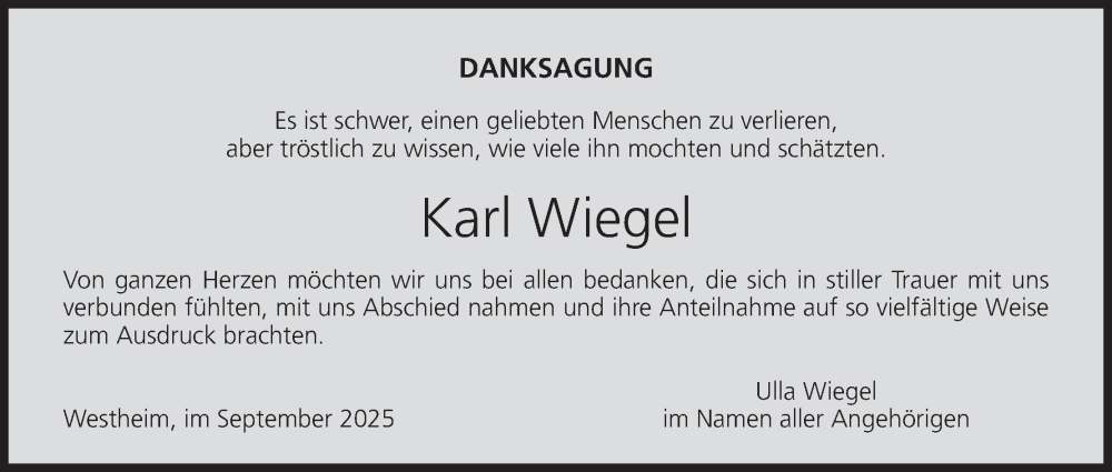 Hier finden Sie alle Traueranzeigen aus der Zeitung, die bisher für Karl Wiegel erschienen sind. Weitere Traueranzeigen, die in der Zeitung erscheinen, werden hier ebenfalls aufgelistet