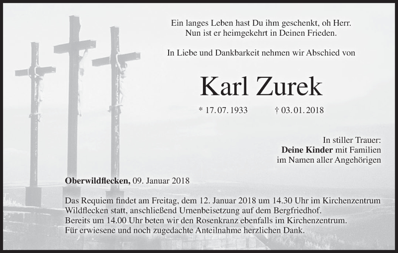 Hier finden Sie alle Traueranzeigen aus der Zeitung, die bisher für Karl Zurek erschienen sind. Weitere Traueranzeigen, die in der Zeitung erscheinen, werden hier ebenfalls aufgelistet