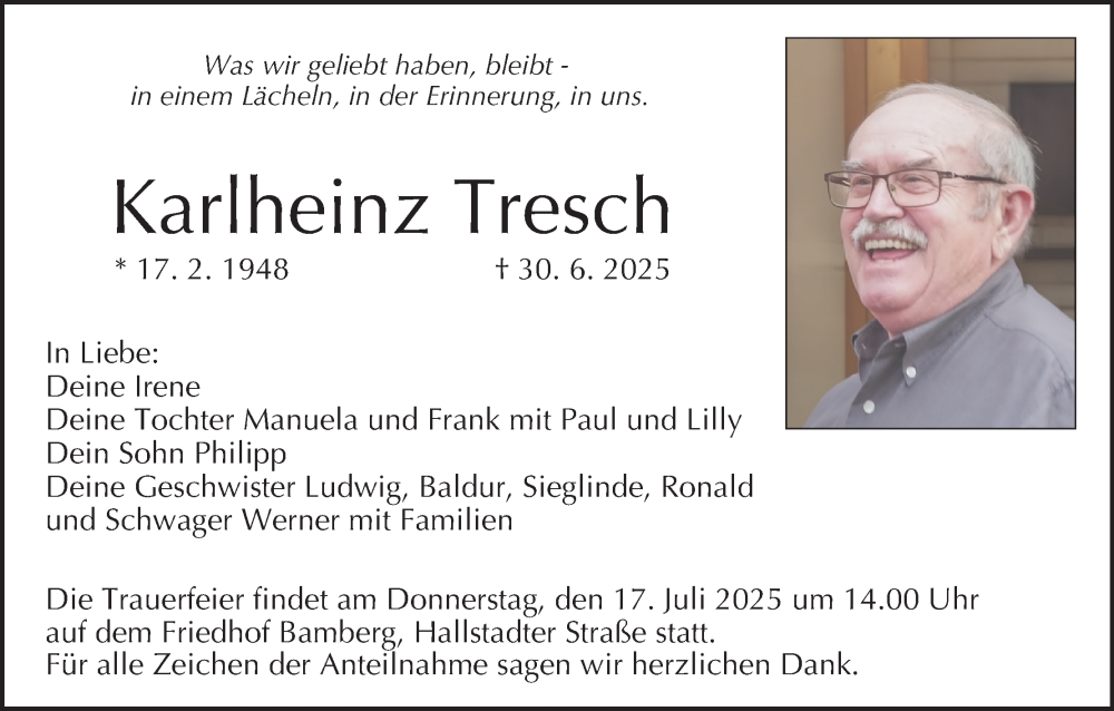 Hier finden Sie alle Traueranzeigen aus der Zeitung, die bisher für Karlheinz Tresch erschienen sind. Weitere Traueranzeigen, die in der Zeitung erscheinen, werden hier ebenfalls aufgelistet