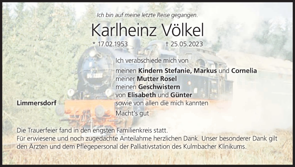 Hier finden Sie alle Traueranzeigen aus der Zeitung, die bisher für Karlheinz Völkel erschienen sind. Weitere Traueranzeigen, die in der Zeitung erscheinen, werden hier ebenfalls aufgelistet