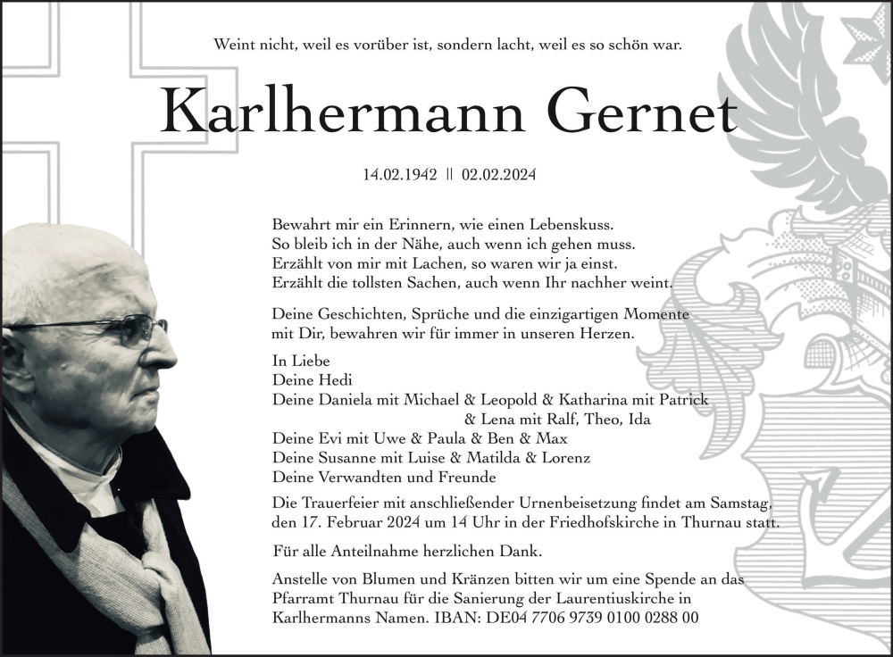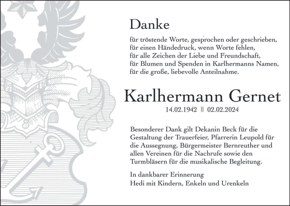 Hier finden Sie alle Traueranzeigen aus der Zeitung, die bisher für Karlhermann Gernet erschienen sind. Weitere Traueranzeigen, die in der Zeitung erscheinen, werden hier ebenfalls aufgelistet