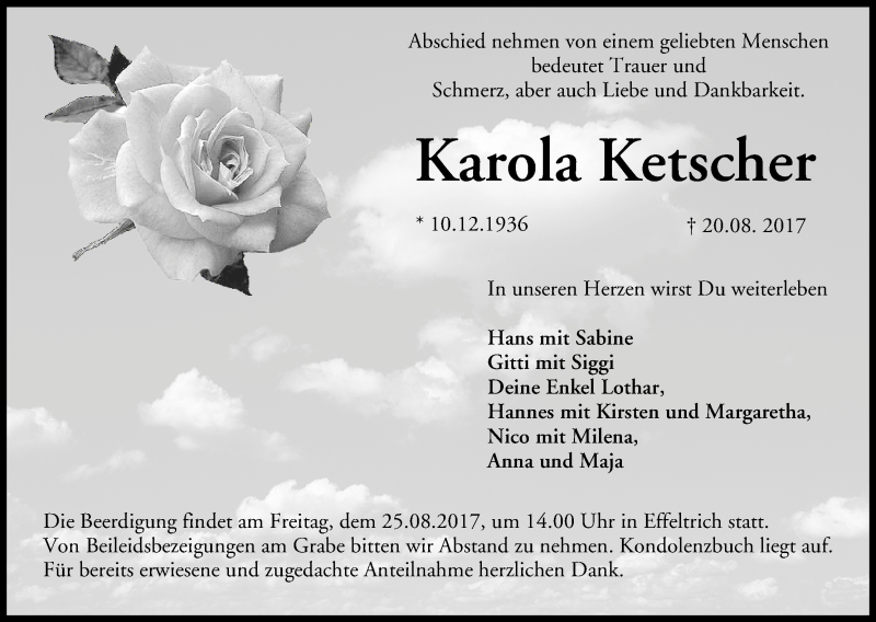 Hier finden Sie alle Traueranzeigen aus der Zeitung, die bisher für Karola Ketscher erschienen sind. Weitere Traueranzeigen, die in der Zeitung erscheinen, werden hier ebenfalls aufgelistet