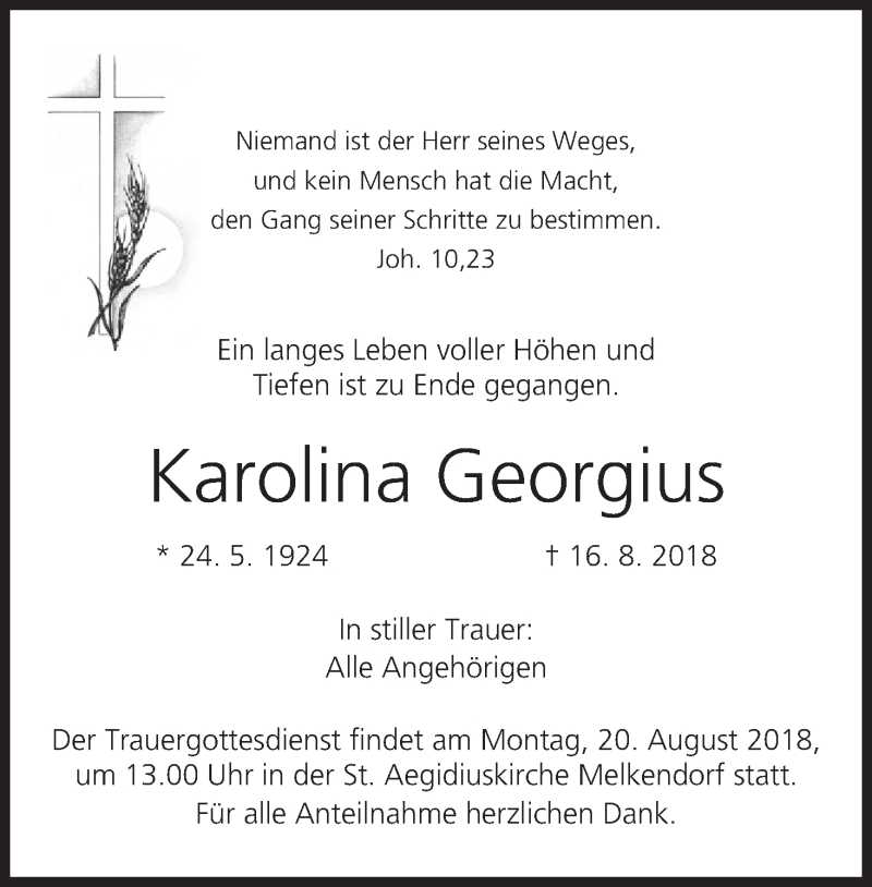 Hier finden Sie alle Traueranzeigen aus der Zeitung, die bisher für Karolina Georgius erschienen sind. Weitere Traueranzeigen, die in der Zeitung erscheinen, werden hier ebenfalls aufgelistet