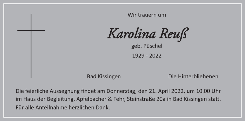Hier finden Sie alle Traueranzeigen aus der Zeitung, die bisher für Karolina Reuß erschienen sind. Weitere Traueranzeigen, die in der Zeitung erscheinen, werden hier ebenfalls aufgelistet