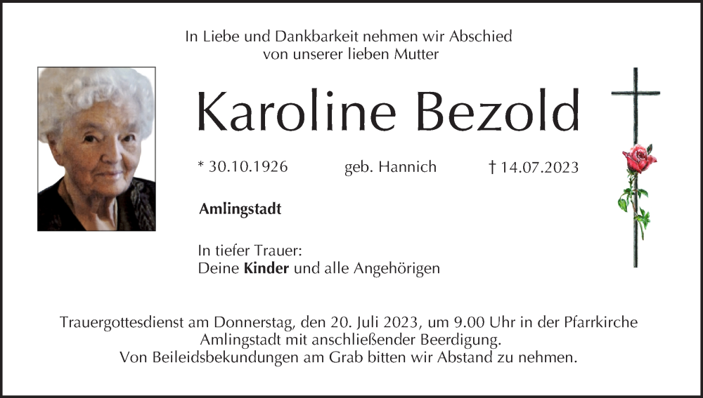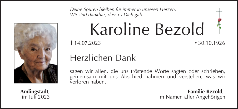 Hier finden Sie alle Traueranzeigen aus der Zeitung, die bisher für Karoline Bezold erschienen sind. Weitere Traueranzeigen, die in der Zeitung erscheinen, werden hier ebenfalls aufgelistet