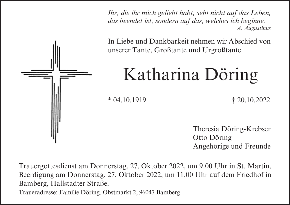 Hier finden Sie alle Traueranzeigen aus der Zeitung, die bisher für Katharina Döring erschienen sind. Weitere Traueranzeigen, die in der Zeitung erscheinen, werden hier ebenfalls aufgelistet