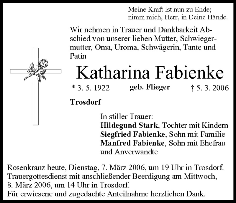 Hier finden Sie alle Traueranzeigen aus der Zeitung, die bisher für Katharina Fabienke erschienen sind. Weitere Traueranzeigen, die in der Zeitung erscheinen, werden hier ebenfalls aufgelistet