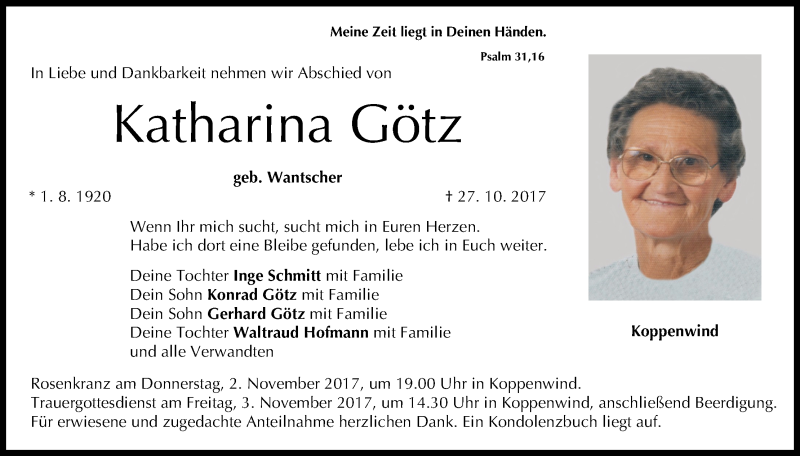 Hier finden Sie alle Traueranzeigen aus der Zeitung, die bisher für Katharina Götz erschienen sind. Weitere Traueranzeigen, die in der Zeitung erscheinen, werden hier ebenfalls aufgelistet