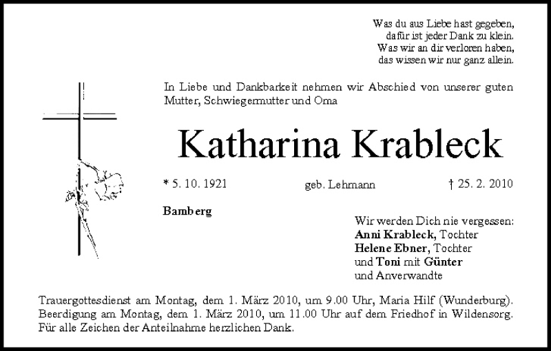 Hier finden Sie alle Traueranzeigen aus der Zeitung, die bisher für Katharina Krableck erschienen sind. Weitere Traueranzeigen, die in der Zeitung erscheinen, werden hier ebenfalls aufgelistet