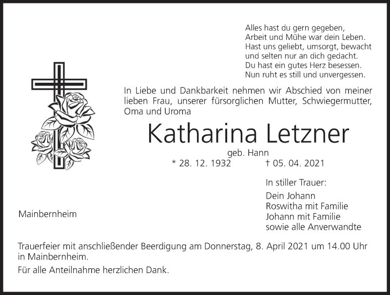Hier finden Sie alle Traueranzeigen aus der Zeitung, die bisher für Katharina Letzner erschienen sind. Weitere Traueranzeigen, die in der Zeitung erscheinen, werden hier ebenfalls aufgelistet