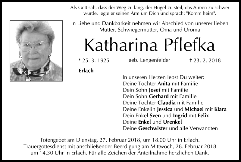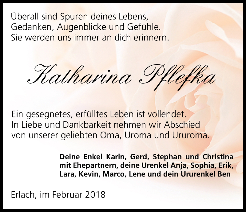 Hier finden Sie alle Traueranzeigen aus der Zeitung, die bisher für Katharina Pflefka erschienen sind. Weitere Traueranzeigen, die in der Zeitung erscheinen, werden hier ebenfalls aufgelistet