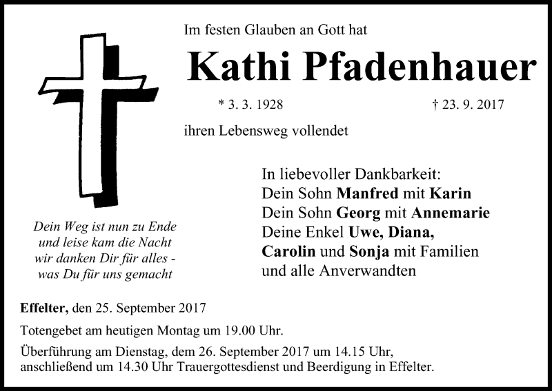 Hier finden Sie alle Traueranzeigen aus der Zeitung, die bisher für Kathi Pfadenhauer erschienen sind. Weitere Traueranzeigen, die in der Zeitung erscheinen, werden hier ebenfalls aufgelistet
