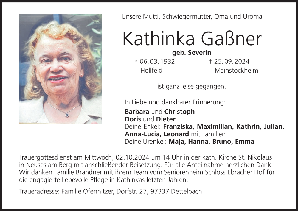 Hier finden Sie alle Traueranzeigen aus der Zeitung, die bisher für Kathinka Gaßner erschienen sind. Weitere Traueranzeigen, die in der Zeitung erscheinen, werden hier ebenfalls aufgelistet