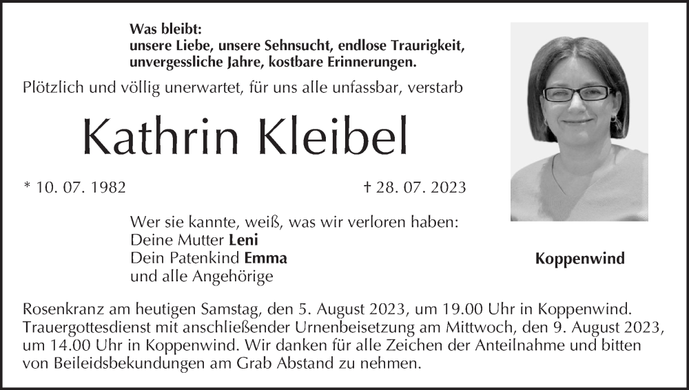 Hier finden Sie alle Traueranzeigen aus der Zeitung, die bisher für Kathrin Kleibel erschienen sind. Weitere Traueranzeigen, die in der Zeitung erscheinen, werden hier ebenfalls aufgelistet