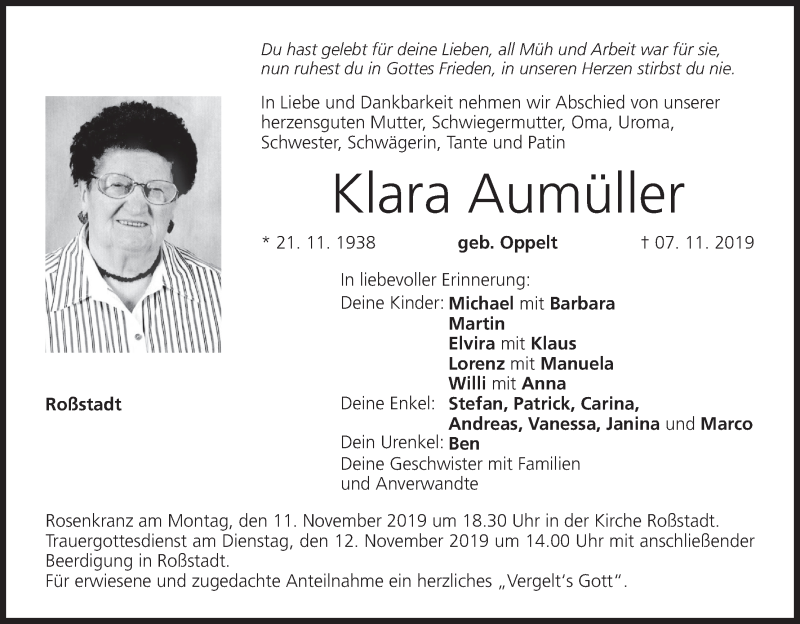 Hier finden Sie alle Traueranzeigen aus der Zeitung, die bisher für Klara Aumüller erschienen sind. Weitere Traueranzeigen, die in der Zeitung erscheinen, werden hier ebenfalls aufgelistet