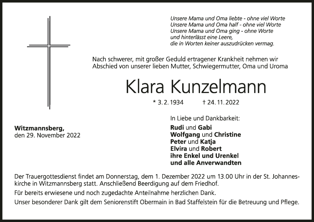 Hier finden Sie alle Traueranzeigen aus der Zeitung, die bisher für Klara Kunzelmann erschienen sind. Weitere Traueranzeigen, die in der Zeitung erscheinen, werden hier ebenfalls aufgelistet