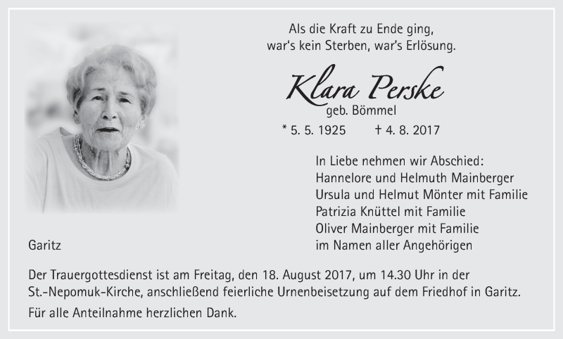 Hier finden Sie alle Traueranzeigen aus der Zeitung, die bisher für Klara Perske erschienen sind. Weitere Traueranzeigen, die in der Zeitung erscheinen, werden hier ebenfalls aufgelistet