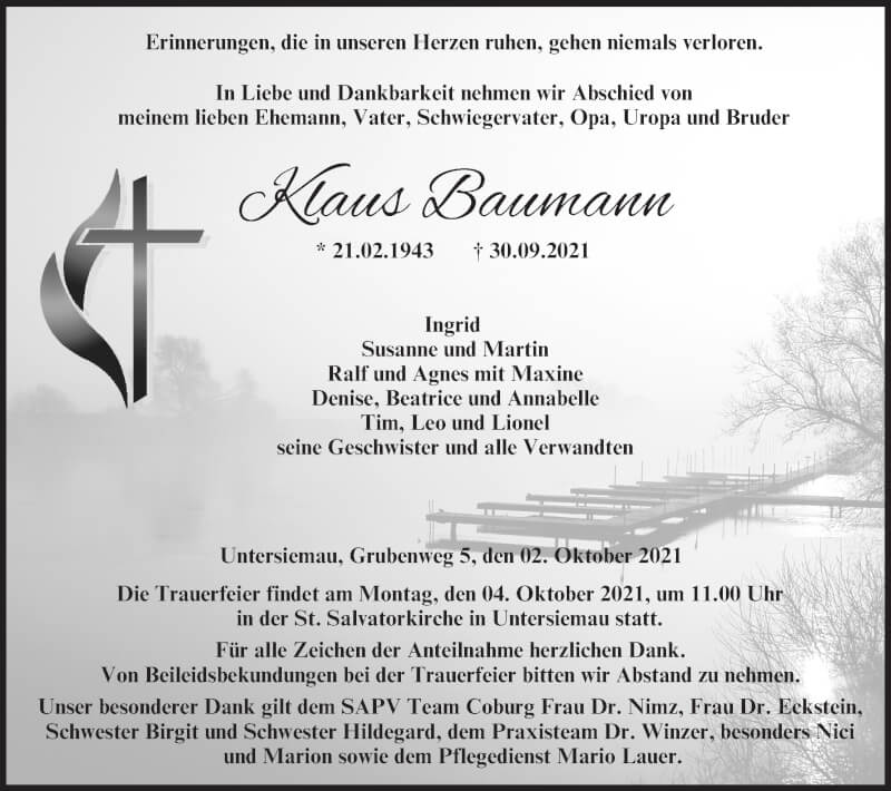 Hier finden Sie alle Traueranzeigen aus der Zeitung, die bisher für Klaus Baumann erschienen sind. Weitere Traueranzeigen, die in der Zeitung erscheinen, werden hier ebenfalls aufgelistet