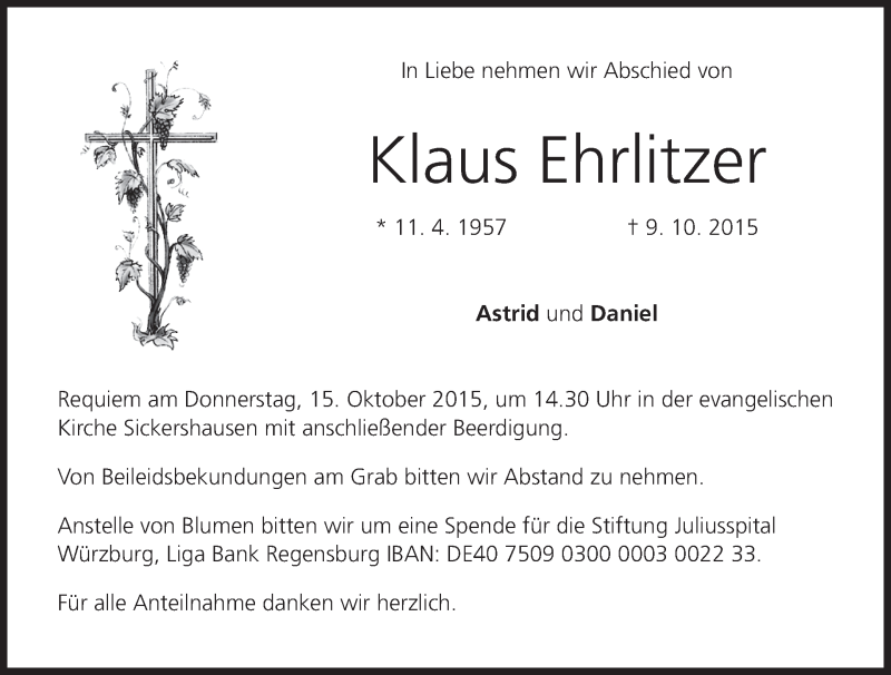 Hier finden Sie alle Traueranzeigen aus der Zeitung, die bisher für Klaus Ehrlitzer erschienen sind. Weitere Traueranzeigen, die in der Zeitung erscheinen, werden hier ebenfalls aufgelistet