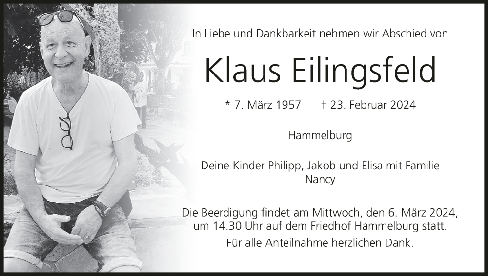 Hier finden Sie alle Traueranzeigen aus der Zeitung, die bisher für Klaus Eilingsfeld erschienen sind. Weitere Traueranzeigen, die in der Zeitung erscheinen, werden hier ebenfalls aufgelistet