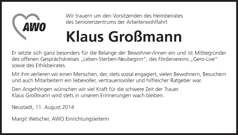 Hier finden Sie alle Traueranzeigen aus der Zeitung, die bisher für Klaus Großmann erschienen sind. Weitere Traueranzeigen, die in der Zeitung erscheinen, werden hier ebenfalls aufgelistet
