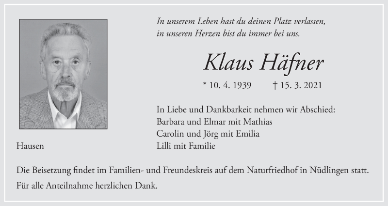 Hier finden Sie alle Traueranzeigen aus der Zeitung, die bisher für Klaus Häfner erschienen sind. Weitere Traueranzeigen, die in der Zeitung erscheinen, werden hier ebenfalls aufgelistet