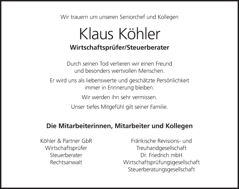 Hier finden Sie alle Traueranzeigen aus der Zeitung, die bisher für Klaus Köhler erschienen sind. Weitere Traueranzeigen, die in der Zeitung erscheinen, werden hier ebenfalls aufgelistet
