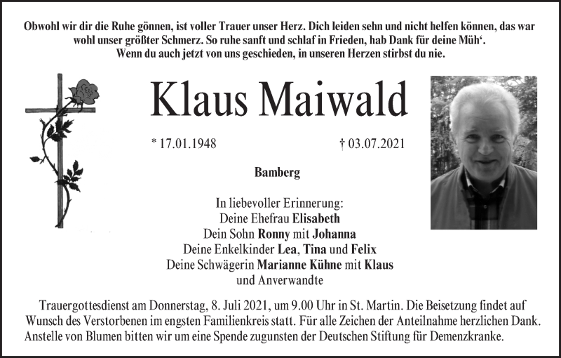 Hier finden Sie alle Traueranzeigen aus der Zeitung, die bisher für Klaus Maiwald erschienen sind. Weitere Traueranzeigen, die in der Zeitung erscheinen, werden hier ebenfalls aufgelistet