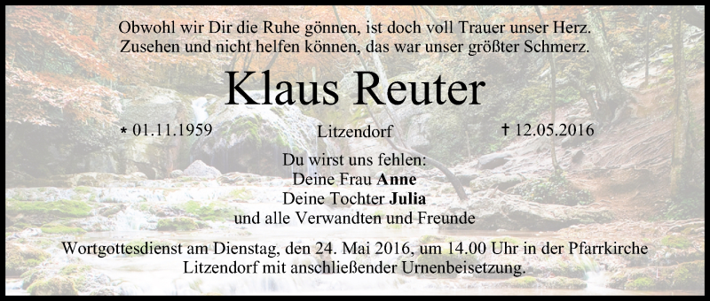 Hier finden Sie alle Traueranzeigen aus der Zeitung, die bisher für Klaus Reuter erschienen sind. Weitere Traueranzeigen, die in der Zeitung erscheinen, werden hier ebenfalls aufgelistet