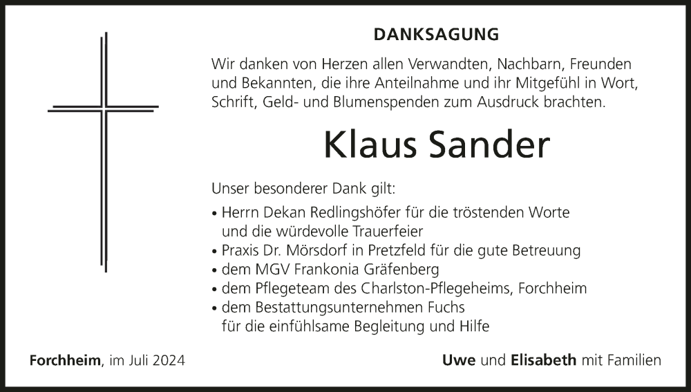 Hier finden Sie alle Traueranzeigen aus der Zeitung, die bisher für Klaus Sander erschienen sind. Weitere Traueranzeigen, die in der Zeitung erscheinen, werden hier ebenfalls aufgelistet