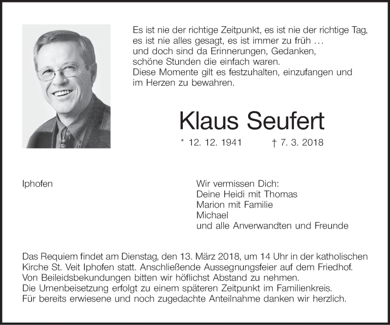 Hier finden Sie alle Traueranzeigen aus der Zeitung, die bisher für Klaus Seufert erschienen sind. Weitere Traueranzeigen, die in der Zeitung erscheinen, werden hier ebenfalls aufgelistet